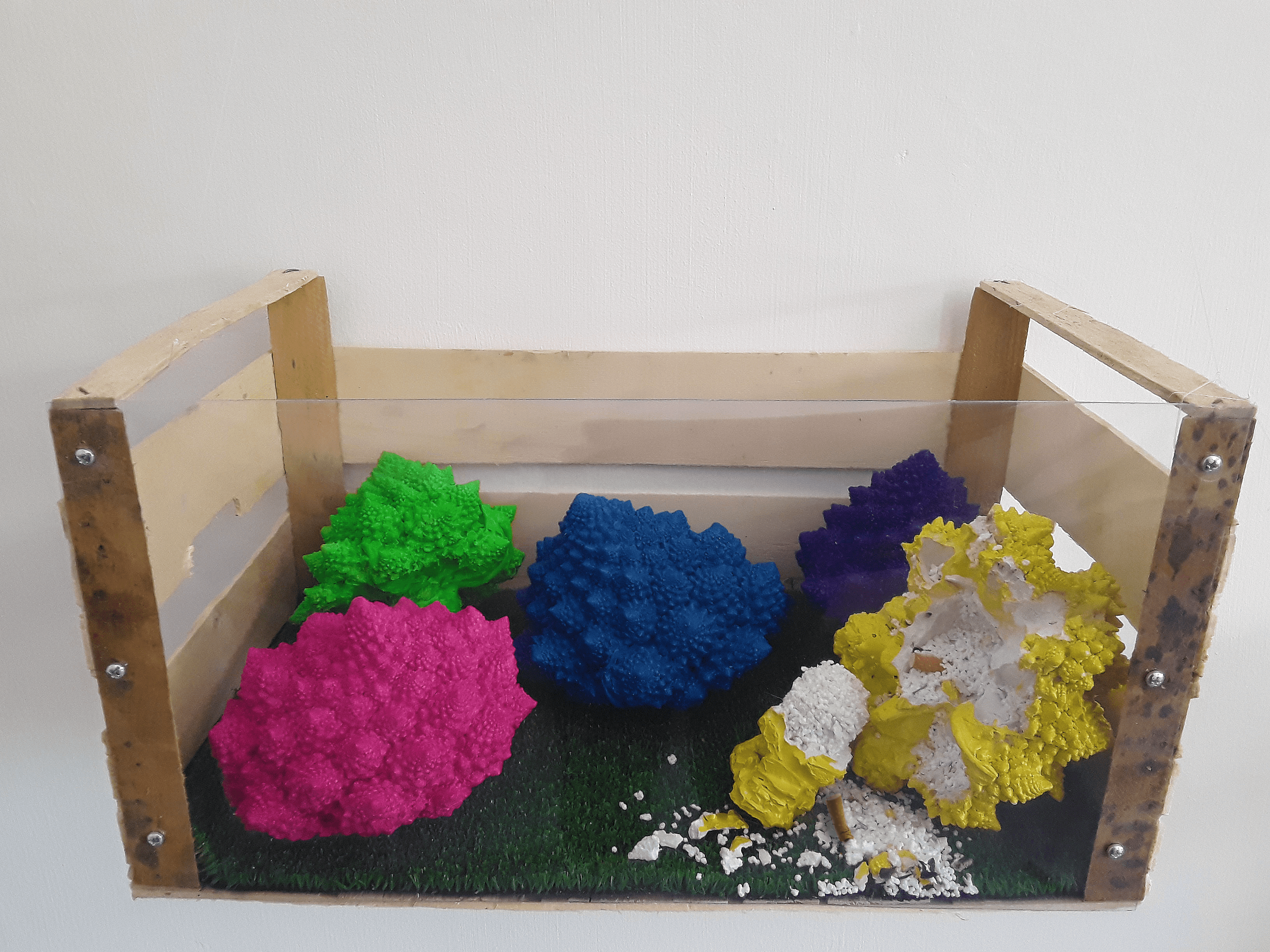 PLEXIGRASS, cinque calchi in gesso ripieni di polistirolo, plastiche e sigarette, erba sintetica, foglio in plexiglass, cassetta di legno, cm 50x30x26