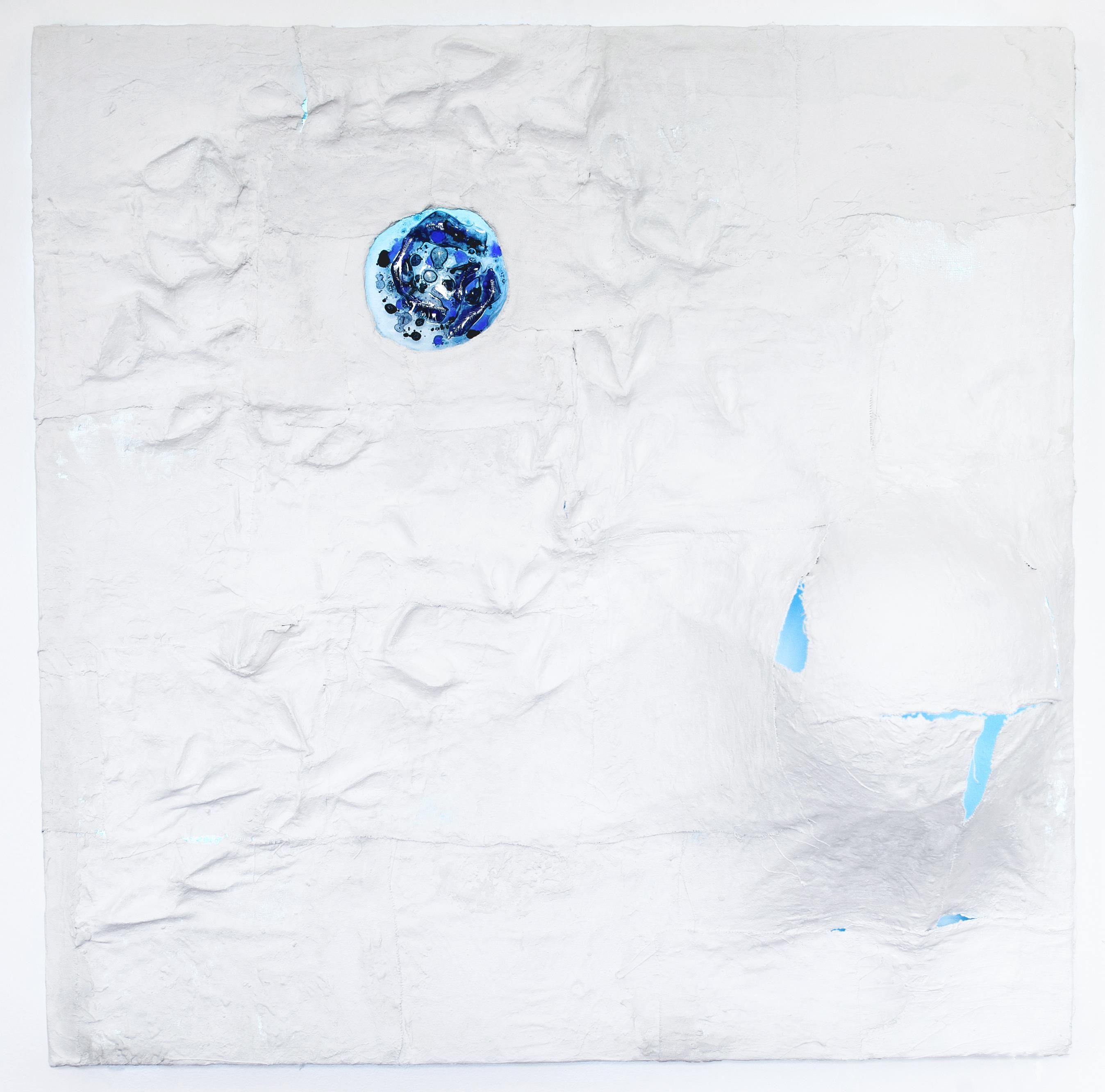 MARE MATRICE-RIORGANIZZAZIONE, garza, gesso e vetro fuso con lische di pesce e ossidi, leds, telecomando RGB, cm100x100x27